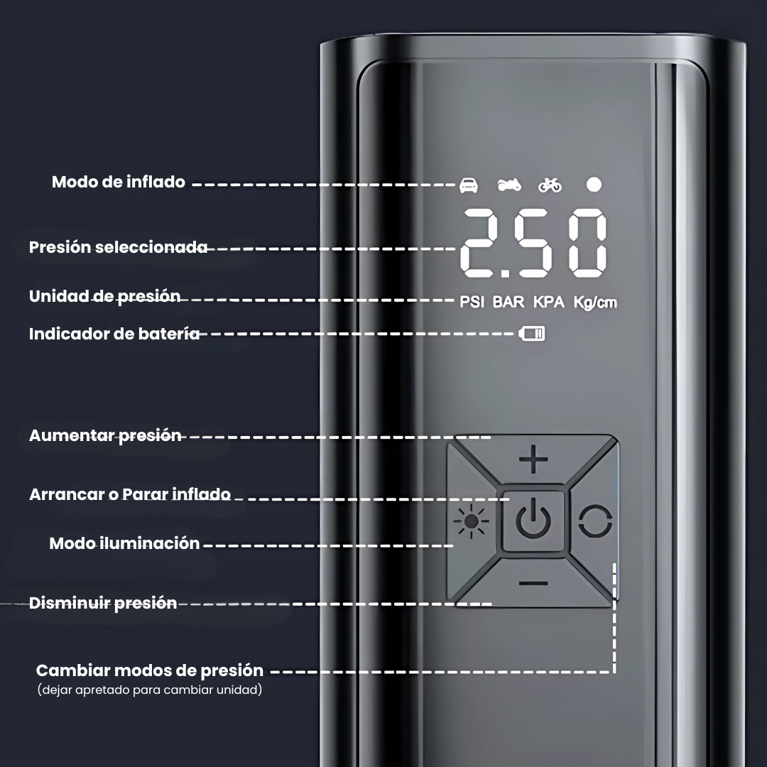 Gracias a su batería recargable e inalámbrica, este inflador te permite inflar neumáticos sin depender de tomas eléctricas. Ideal para emergencias o viajes largos.